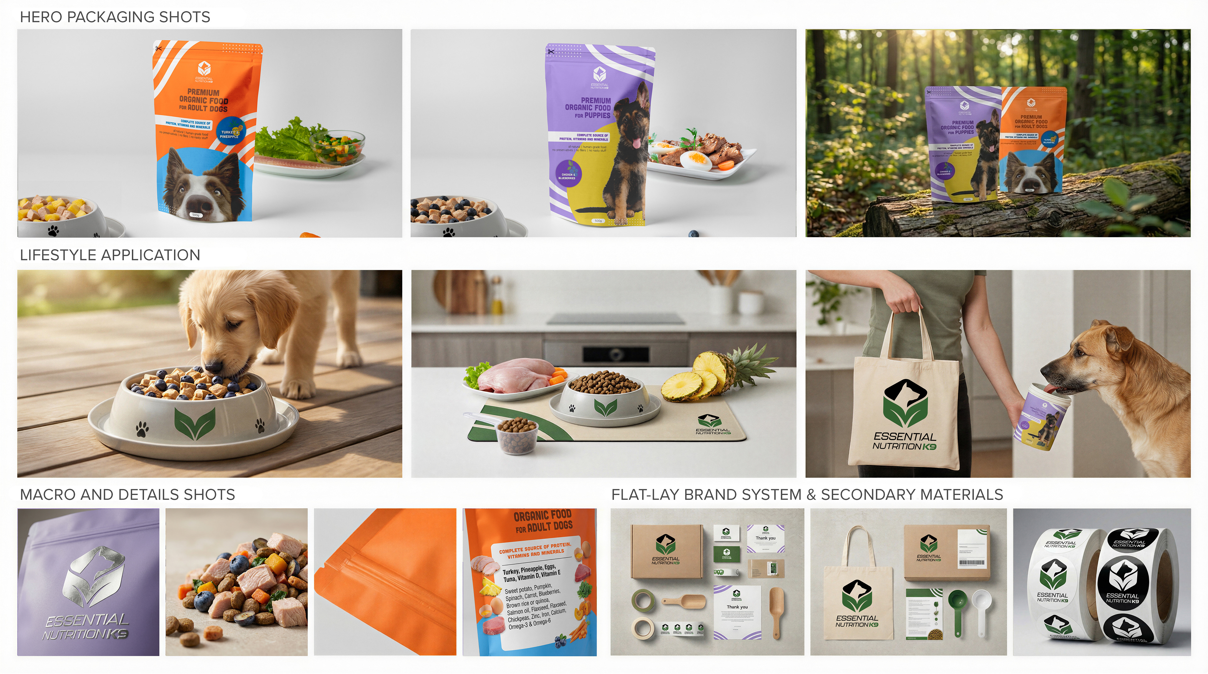 Through considered typography, structured layouts, and consistent application across packaging and brand materials, Essential Nutrition K9 gained a stronger, more recognisable presence. The result is a visual identity that supports the brand’s nutritional philosophy and builds trust with its audience at every point of interaction.